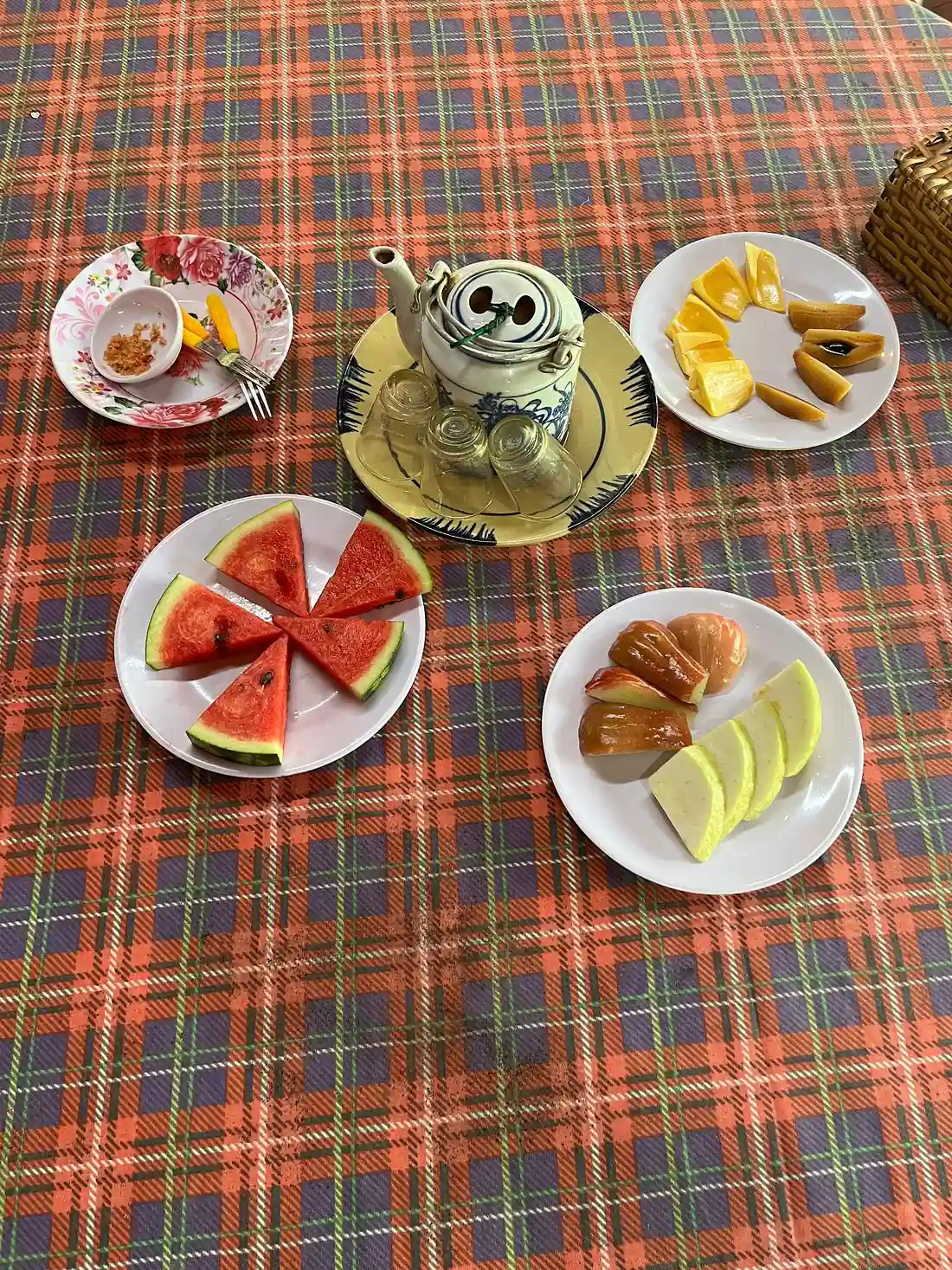 - Breakfast, water and local fruits