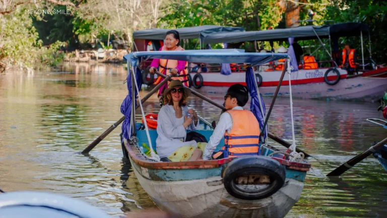 At 12:00 PM, you'll experience the quintessential Mekong moment: the rowing sampan ride. Local people will guide you on a small boat through a quiet canal flanked by beautiful water coconut trees.